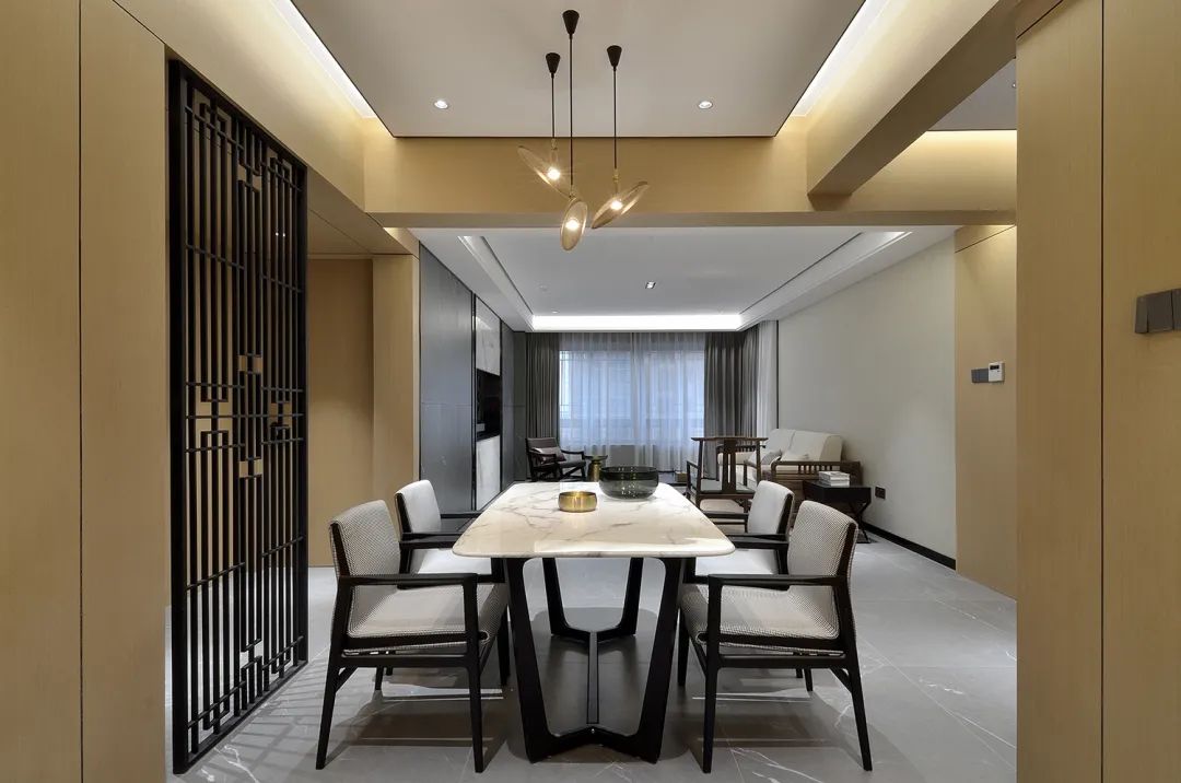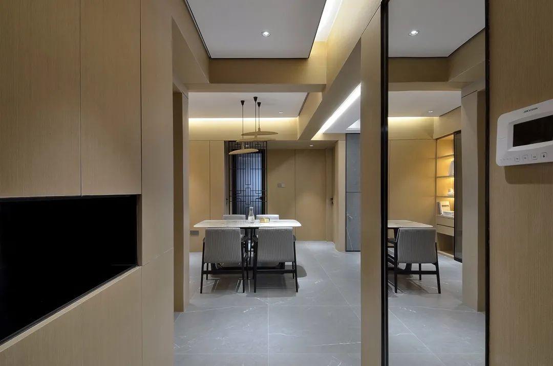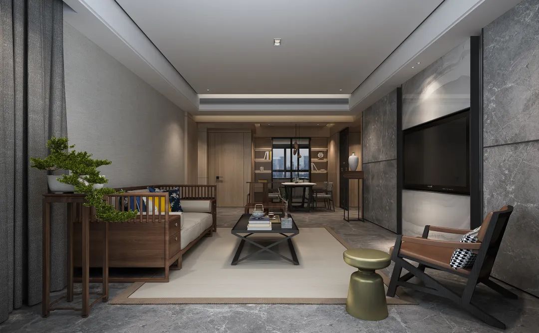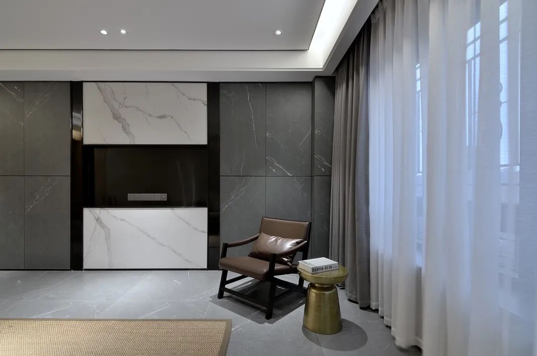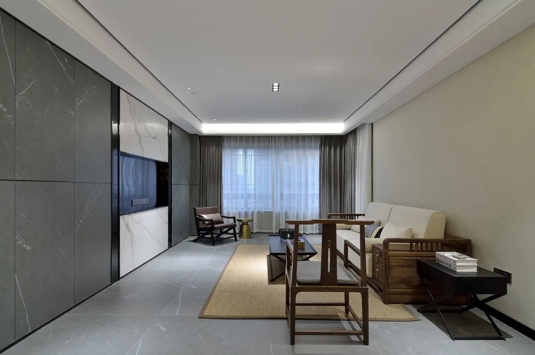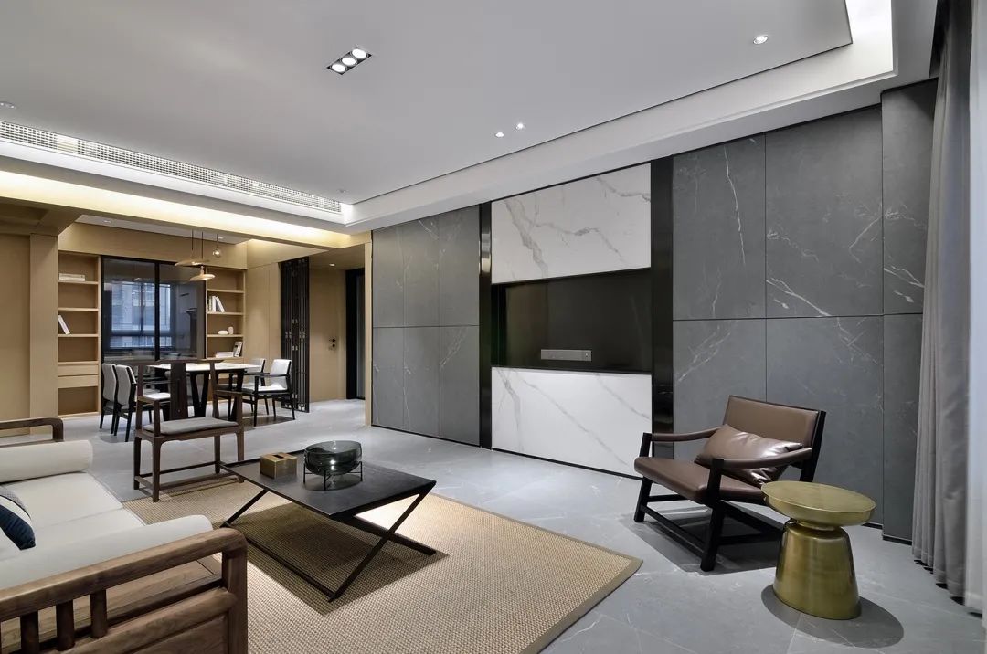 ▲客廳保持簡潔高級的黑白灰空間基調,在無主燈的空間氛圍下,布置上新中式的家具,營造出一種極簡端莊的高級空間感。