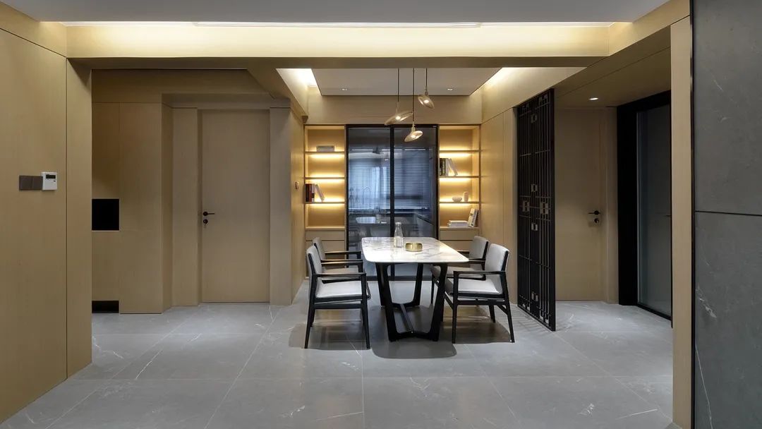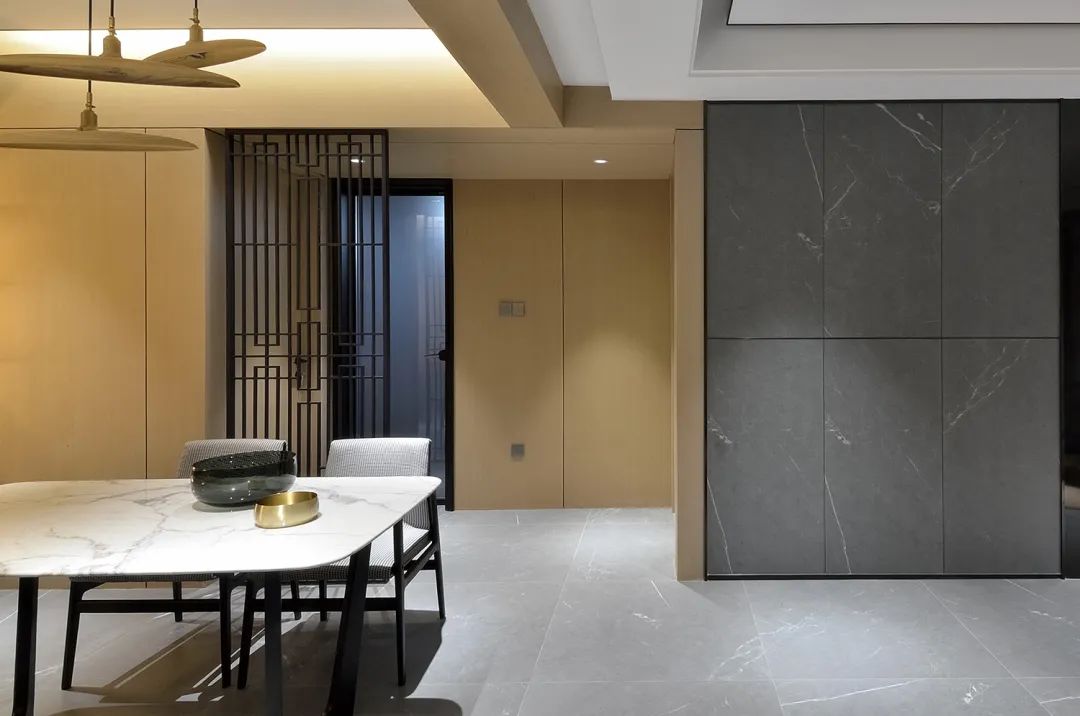 ▲餐廳空間在木色的墻面基礎,在與衛生間之間加入一道黑色屏風,形成一種簡潔現代的大方氣質感。