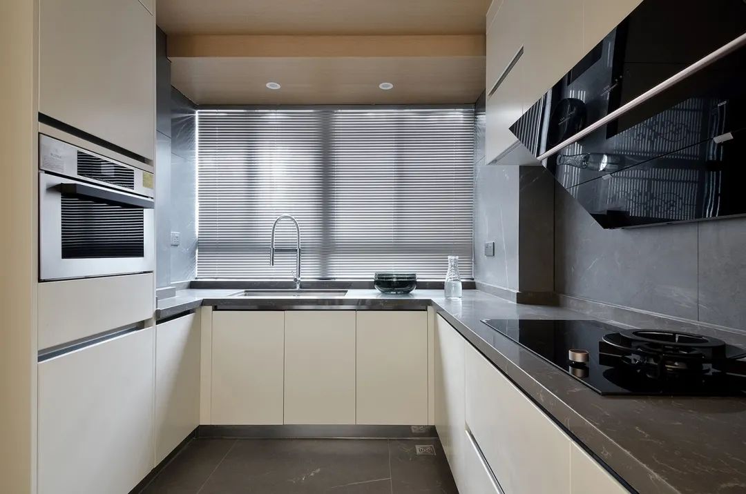▲廚房在灰色墻面地面與操作臺空間基礎,加入白色的櫥柜,左側電器柜把烤蒸箱嵌入,窗戶也加入百葉簾的搭配,讓做飯空間也更加時尚現代。