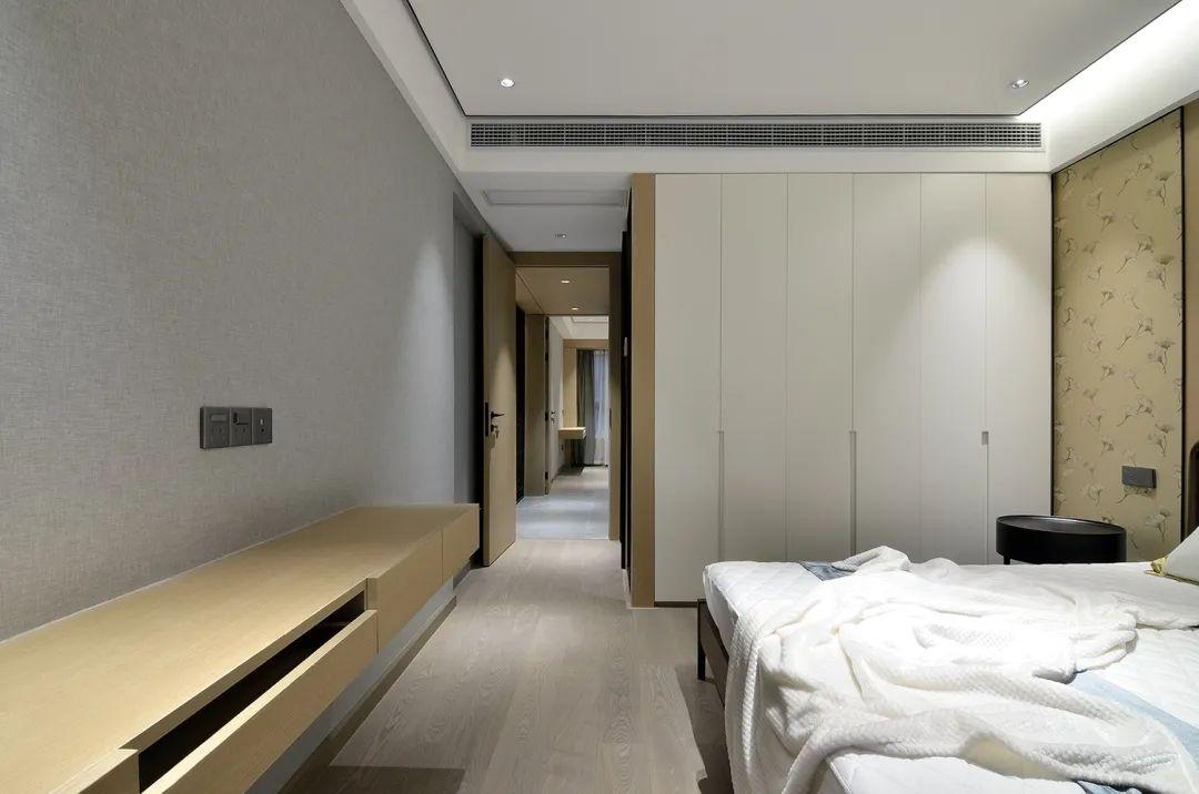 ▲次臥以灰色的床頭墻,布置鏤空的胡桃木靠背床,干凈素雅的床單,極簡的衣柜造型,簡單而不失優雅質感。