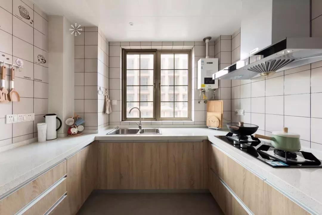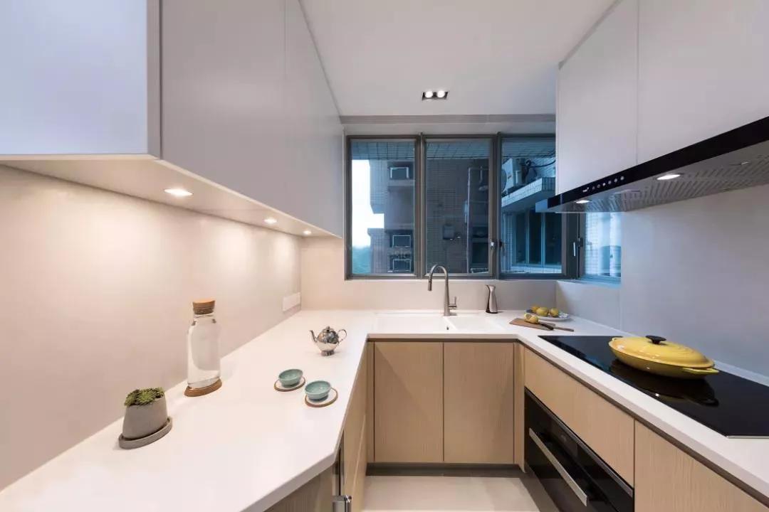 如果你家廚房戶型方正,就很適合U型布局。U型布局儲物功能強大,水槽設置在U型中間,符合人體工程學,在做飯的時候炒菜、切菜及常見工具都可以放在左右兩側,非常方便。