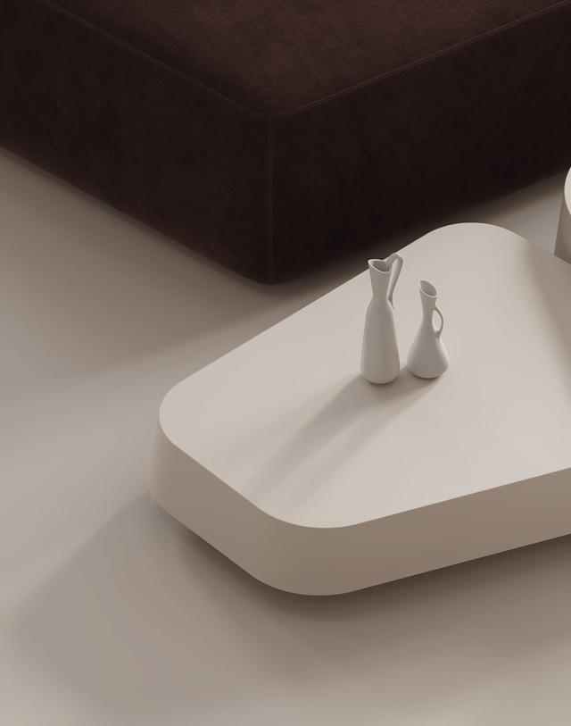 白色的裝飾花瓶擺放在白色的現(xiàn)代咖啡桌上,仿佛是用一整塊粘土做成的。