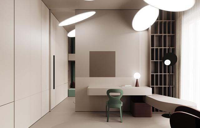 另一種ufo式的照明侵入了孩子們的臥室。深紅色和綠色的故事也在這里延續(xù),讓所有的區(qū)域都感到舒適的統(tǒng)一和流動。