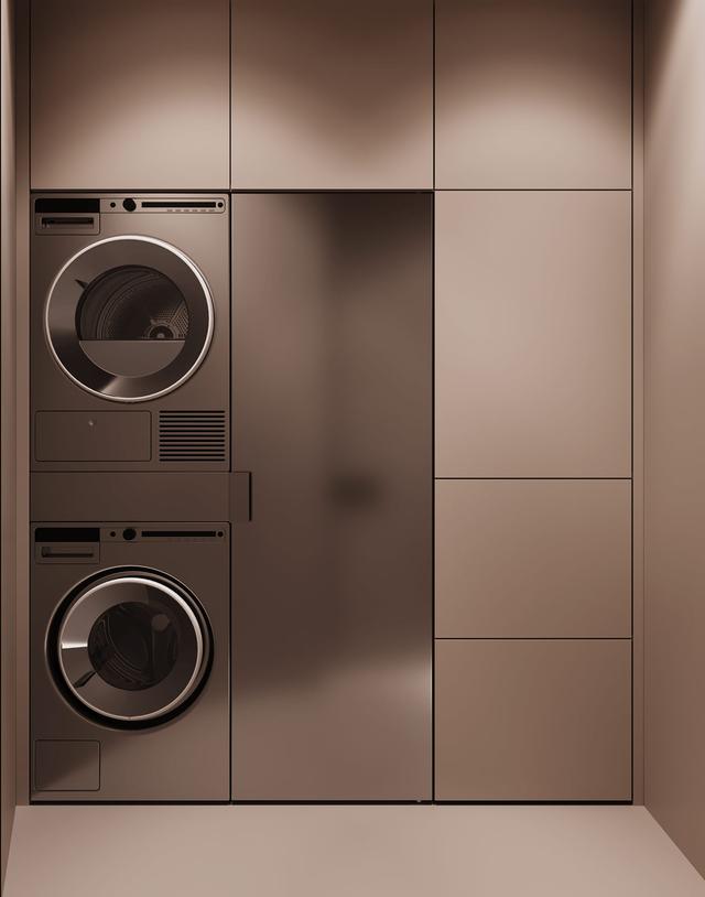 在一扇普通的走廊門后面,有一間專門的雜物間,里面有一臺堆疊的洗衣機和滾筒式烘干機。