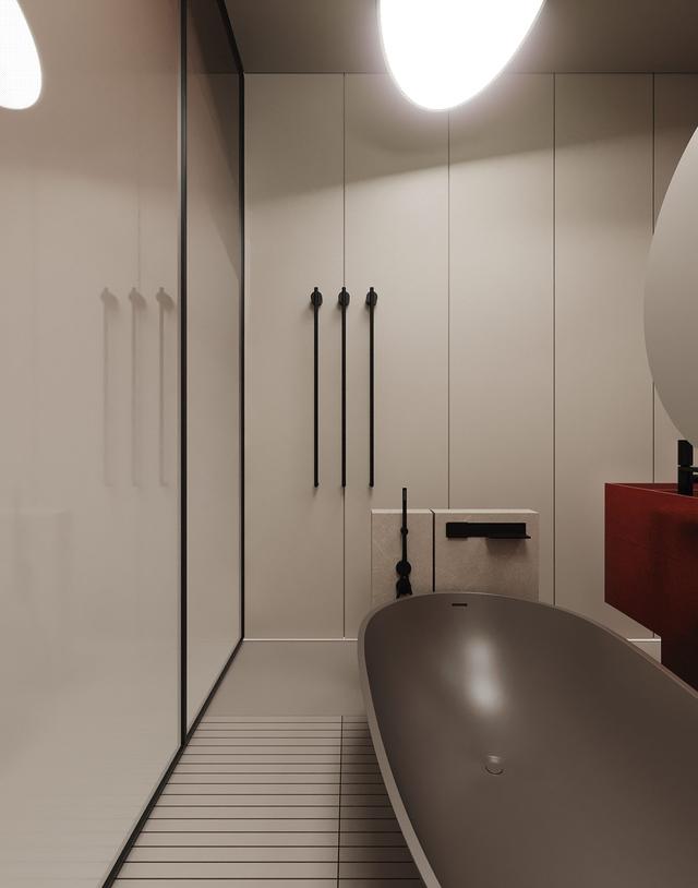 下一個浴室設(shè)計將橢圓形浴缸換成了更線性的外觀。雕刻的紅色墻板增加了角的效果。