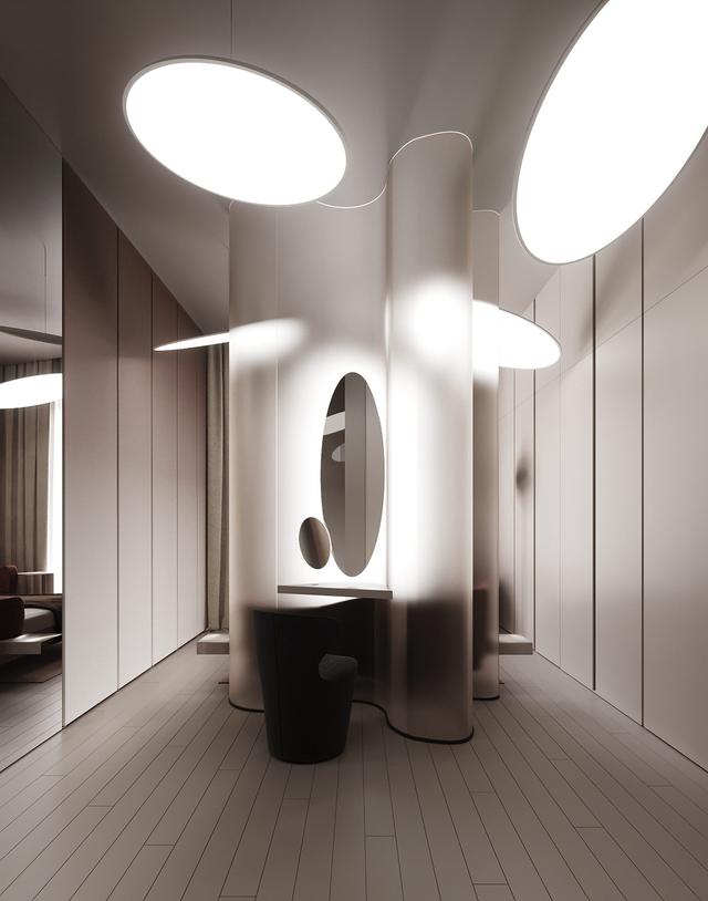在主臥室里,有一個梳妝臺中心,它的結(jié)構(gòu)就像是為母船準(zhǔn)備的某種能量核心。波浪形的有機玻璃被塑造成一個令人印象深刻的柱子,讓光線滲透進(jìn)來,但模糊了另一邊的床的視野。