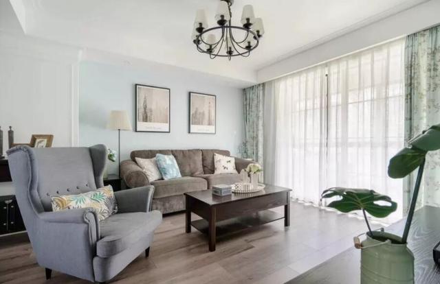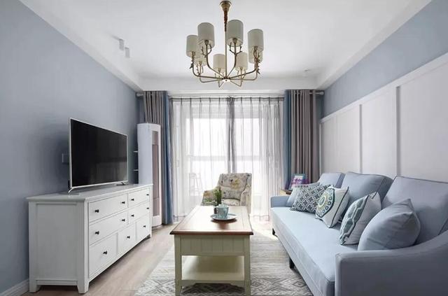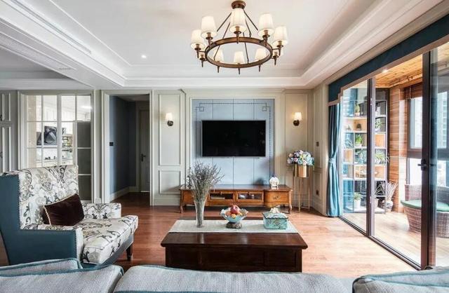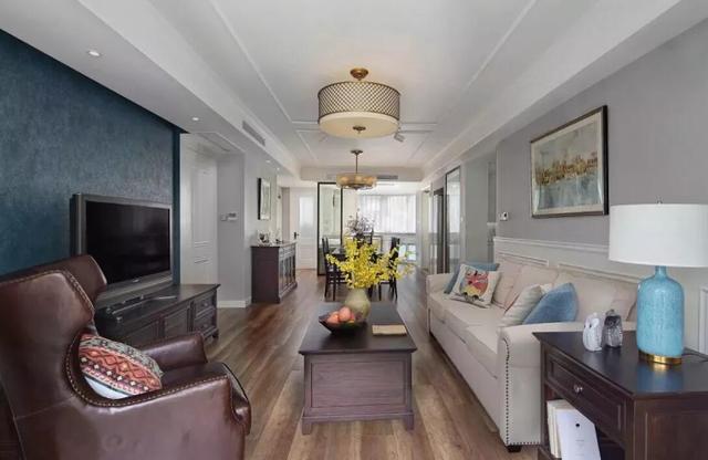 想要簡約的美式風,那么復古吊燈+清新的配色是必不可少的,淺淡的藍色讓整個客廳十分通透,復古的燈具讓整個空間更有奢華感,兩者相配,和諧又自然。