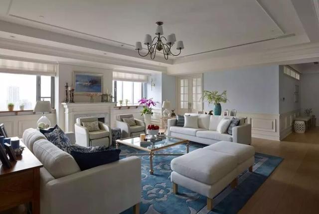 想要比較純種的美式風,那么可以選擇藍色地毯搭配白色壁爐,復古歐式氣息十足。