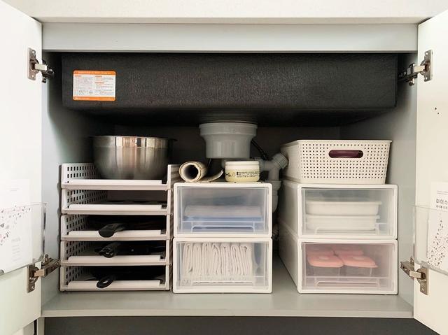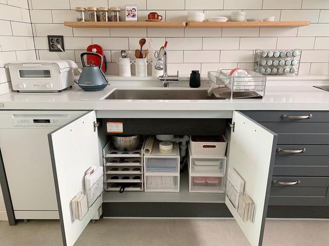 另外水槽底下的空間也不要浪費(fèi)了,如果水槽下方?jīng)]有裝凈水器之類(lèi),可以用一些收納工具,把水槽下方空間用起來(lái)。