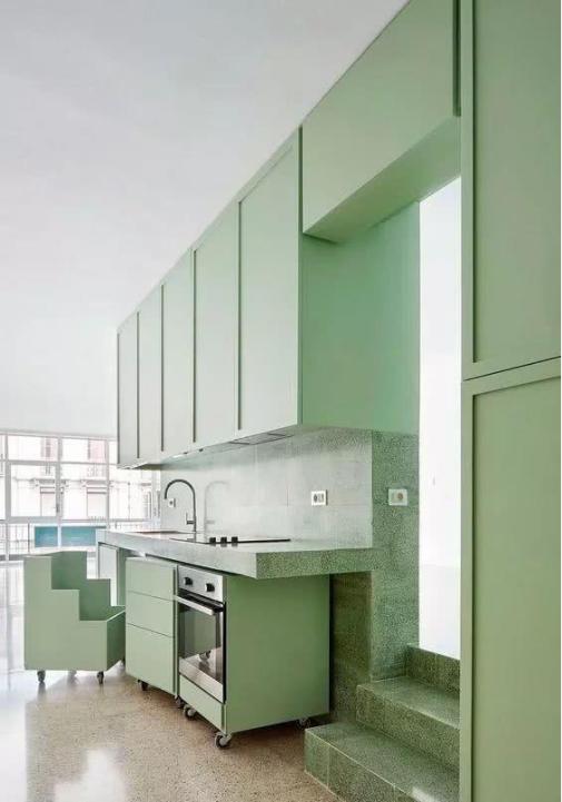 比如可以采用撞色搭配,就像下面這個廚房,淺綠色和大紅色搭配非常有沖擊力,色彩交相輝映,層次分明,非常凸顯個性。