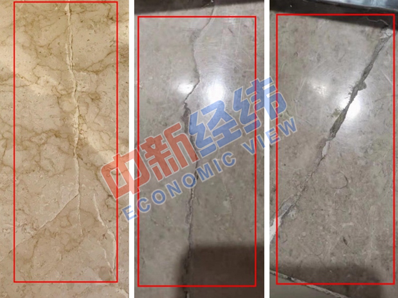 徐楓稱,進入房間就能看到不少地磚是破碎的,裂縫比較明顯,一看就是工人施工的時候拼接起來的;木質地板存在色差問題,能夠有肉眼直接觀察出來;可能是地面潮濕的原因,有業主家中還出現地面返堿的情況。