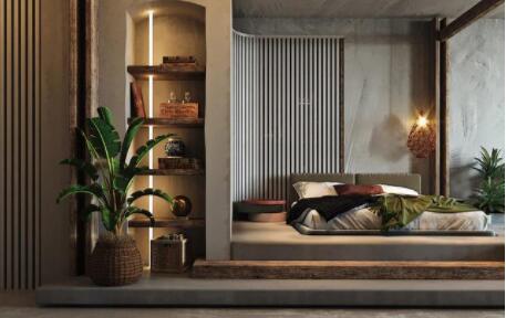 客廳邊就是臥室,采用了地臺設計,同樣的也是水泥造就,還塑造了臺階,上面壘了很多書,看起來很是慵懶隨性。