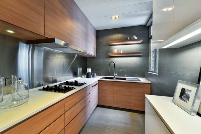 這種布局跟一字型相似,是將不同的功能區分別平行設置在廚房的兩側,適用于長方形且兩側寬度大于2米的廚房。