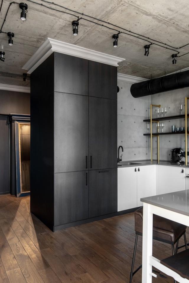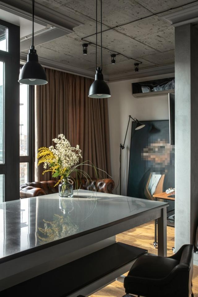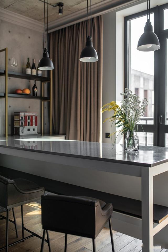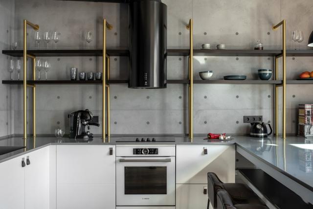 廚房和餐廳酒吧更加開放和動(dòng)感的表達(dá),漂亮的定制貨架與時(shí)尚黃銅結(jié)構(gòu)肋骨為內(nèi)部增添了爵士和藝術(shù)的氛圍。