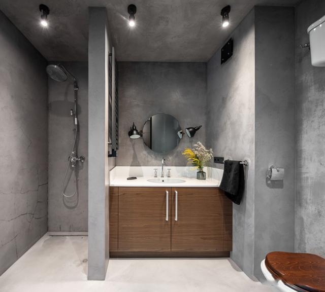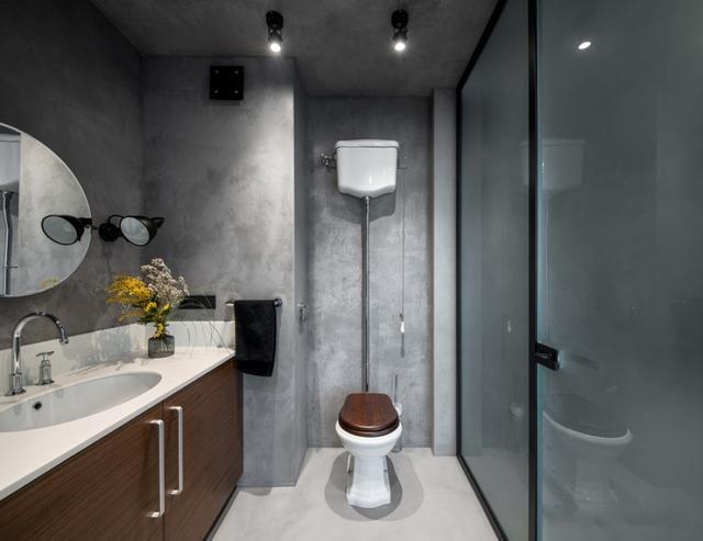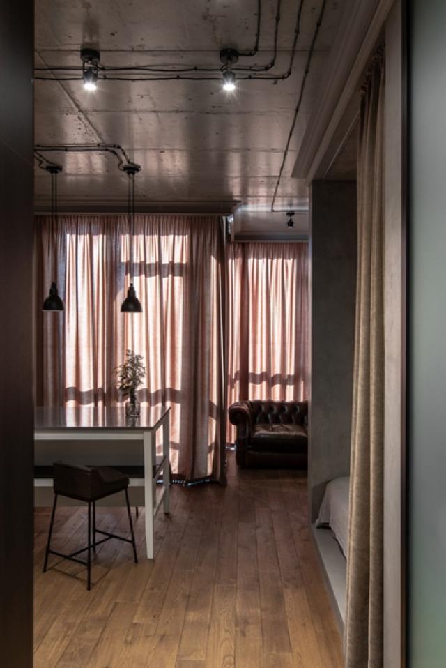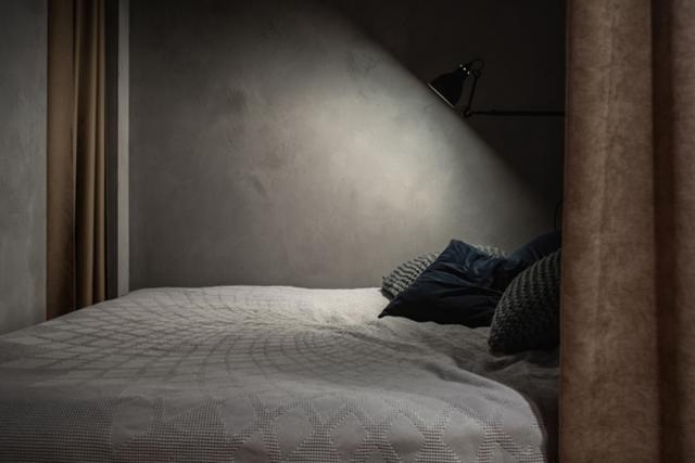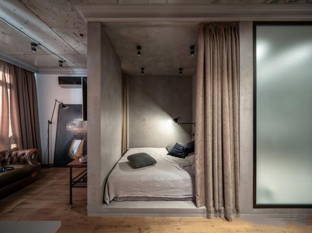 臥室壁龕是空間中最有趣,最巧妙的空間布置元素,隱藏在舒適的落地窗簾和部分水泥覆蓋的墻壁中。另一方面,浴室給人一種寬敞的感覺,墻壁上的水泥飾面與黑色框架和深色木嵌件搭配,營造出了一個(gè)舒適的氛圍。
