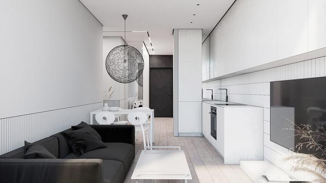 這個類似走廊的黑白客廳具有簡潔的風格,每個簡單的元素只占整體布局的一小部分。一張細長的長方形咖啡桌在一張普通的黑色沙發上灑上一抹白色。一個黑色的吊墜色很好地點綴了一個白色的用餐區。