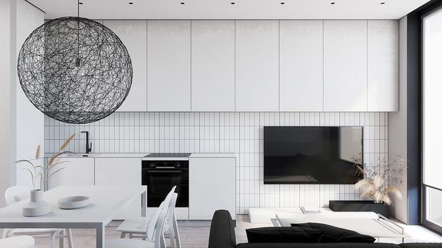 墻上的櫥柜打破了廚房的格局,完成了整個房間的寬度。同樣,白色瓷磚的廚房后擋板也成為了電視墻的裝飾。燈光單位和瓷磚消失在一個大膽的黑色烤箱和黑色電視屏幕的平衡后面。