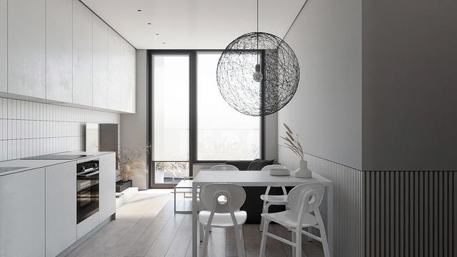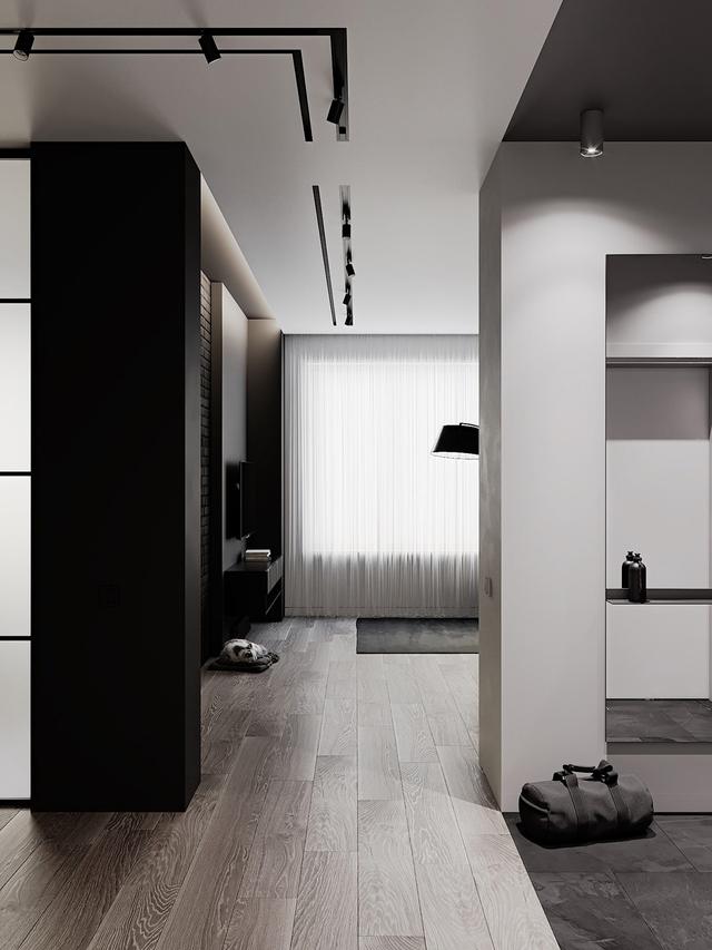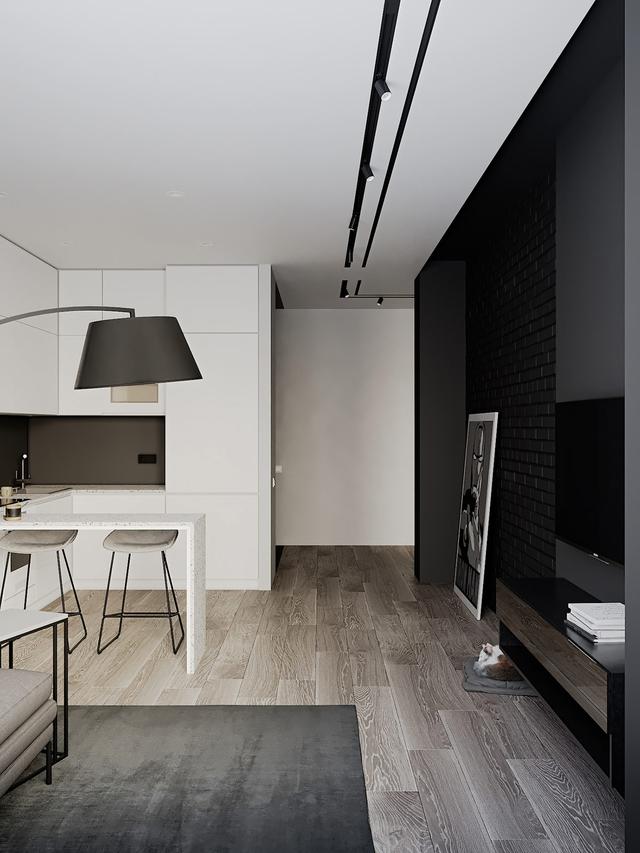 這套公寓是為一個喜歡黑白和驚奇的年輕人設計的。為了在不破壞單色魔法的情況下將這種激情引入室內,海報被重新印刷成灰色漸變。內部是男性化的,沒有額外的裝飾。休息廳布置簡單,一張躺椅沙發和一盞黑色落地燈,盡管黑色的強調墻給了小空間很大的沖擊。