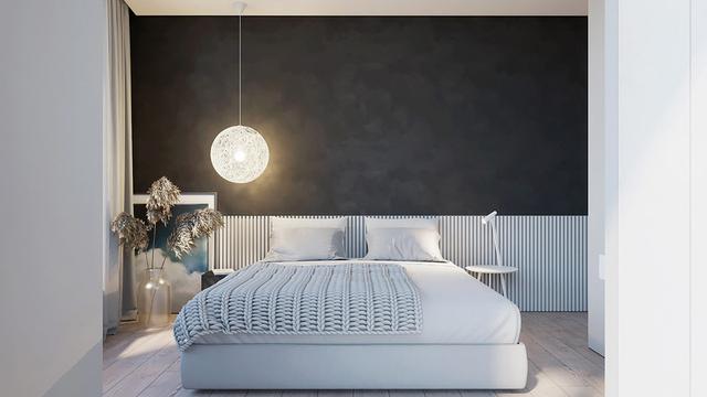 黑白相間的臥室是夢幻般的景象。一面黑色的特色墻在一輪滿月的光后面落下了一張午夜的毯子。當臥室的吊燈照在藝術的展示上時,臺床對面的床頭燈照亮了一個方便的床頭柜。