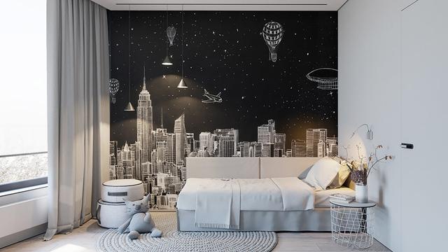 在孩子們的床上,用粉筆畫出了飛機和熱氣球飛過星城的場景。