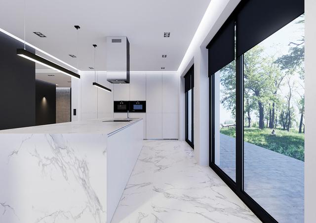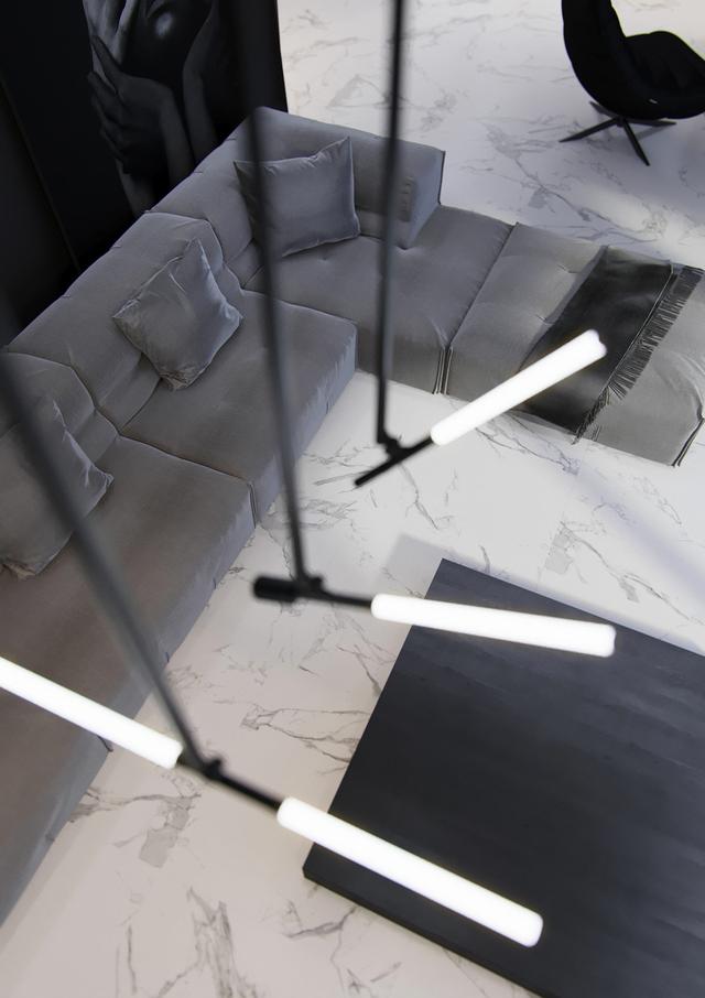 白色大理石瓷磚讓一縷縷灰色紋理穿過客廳的地板。