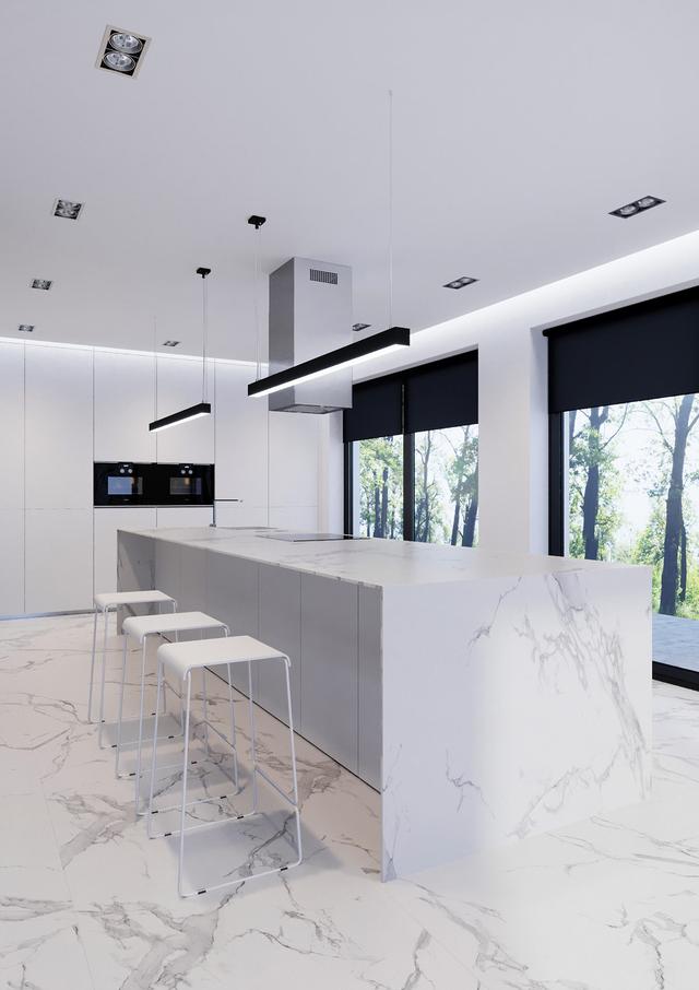 線性懸掛燈上方的大理石廚房島破折號黑色的中斷。