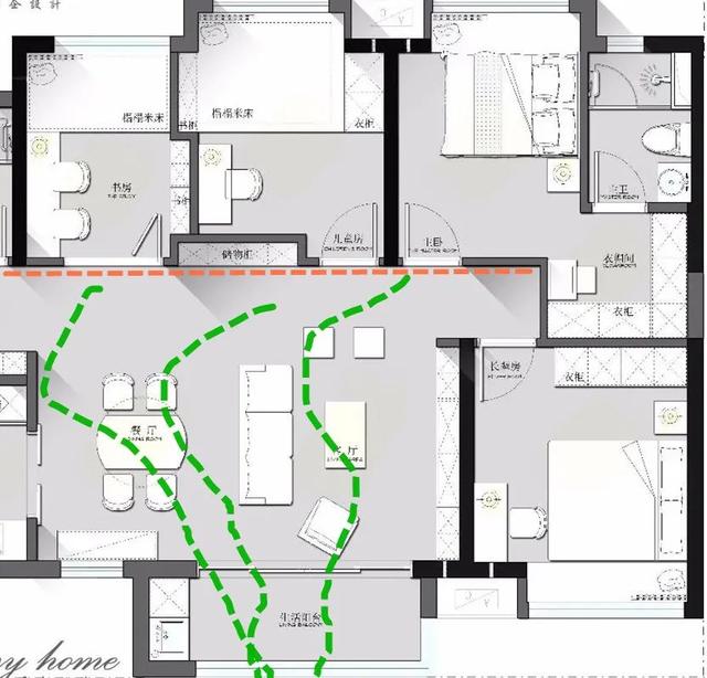 雖然橫廳的空間的利用率高,但是戶型少了過道作為屏障,往往是房間門直對客餐廳,這樣空間動靜分離不明顯,晚上在客廳看電影,就可能會打擾到在臥室休息的家人了。如果家庭作息習慣比較統一倒是沒關系,如果作息習慣不統一的家庭就比較尷尬了。