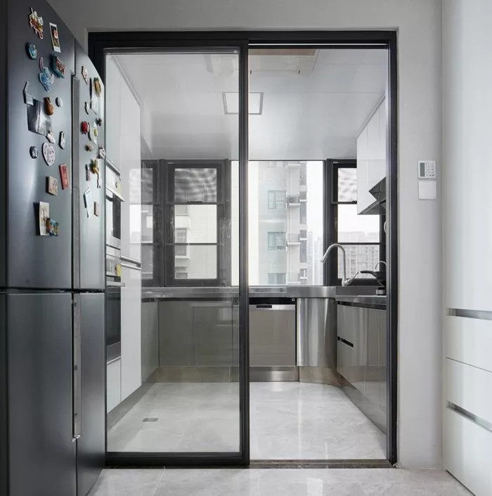 根據廚房結構把老式木門改成滑門或者折疊門,輕松空出門后面的空間;或者選擇靠門的墻邊向上下挖出合適的空間來做儲物空間,比如吊柜。