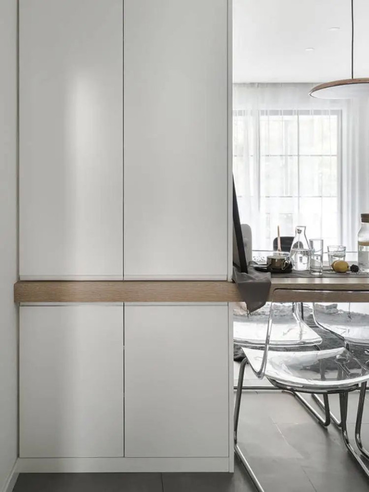 玄關(guān)柜分為兩部分,上面是衣帽柜,下面是鞋柜,而且還和餐桌連為一體,一氣呵成;節(jié)省空間之余還要兩個(gè)區(qū)域的聯(lián)系更加緊密,非常巧妙。