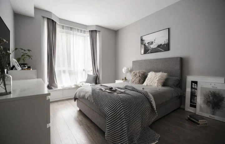 以高級(jí)灰為主調(diào)的臥室,簡(jiǎn)單裝飾,不設(shè)多余的擺設(shè),營(yíng)造輕松愜意的睡眠氛圍。臥室飄窗處還做了兼顧儲(chǔ)物功能的榻榻米,休閑之余還很實(shí)用。