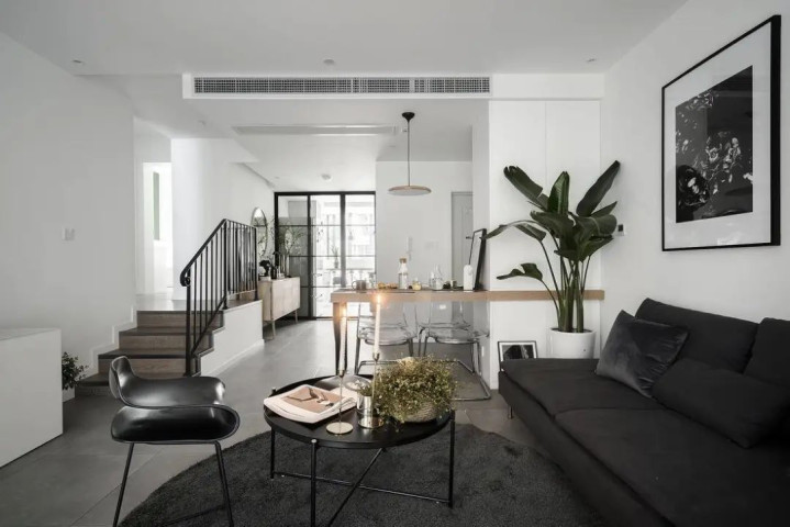 客廳,以大面積白作為空間基底,鋪設(shè)水泥灰色地磚,再用顏色更深的黑色家具和軟裝來(lái)調(diào)和空間的色彩比例,讓視覺(jué)效果達(dá)到平衡。