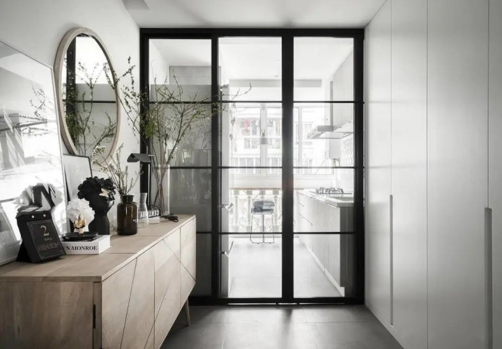 過(guò)道很寬敞,分為左右兩個(gè)部分,中間以黑框玻璃門和廚房隔開(kāi)。右側(cè)安裝到頂式柜體,白色柜門設(shè)計(jì)清爽不壓抑,充分利用空間,有效增加儲(chǔ)物面積。