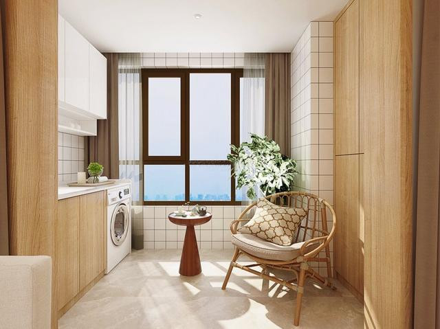 陽臺區(qū)域做了洗衣機(jī)柜和吊柜,墻面使用了網(wǎng)紅小白磚,洗衣機(jī)柜對面還做了雜物柜,同樣使用了原木色。