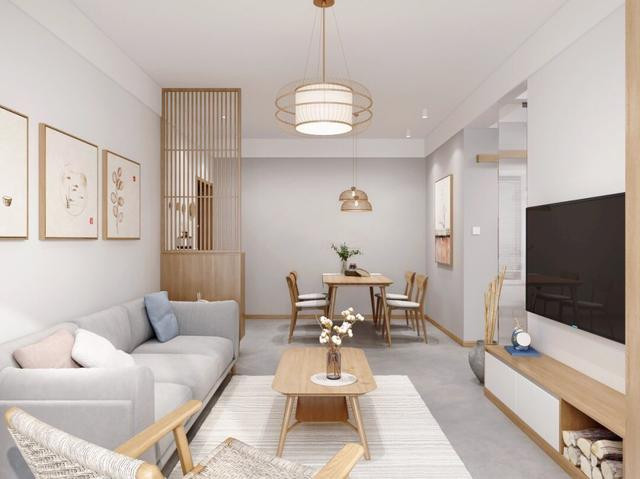 沙發(fā)背景墻沒有做任何造型,按照空間風(fēng)格選擇幾幅裝飾畫,掛在墻上就會很漂亮。可以看出整個客廳空間除了有個原木色的屏風(fēng),幾乎沒有多余的造型,可以說非常簡潔了。