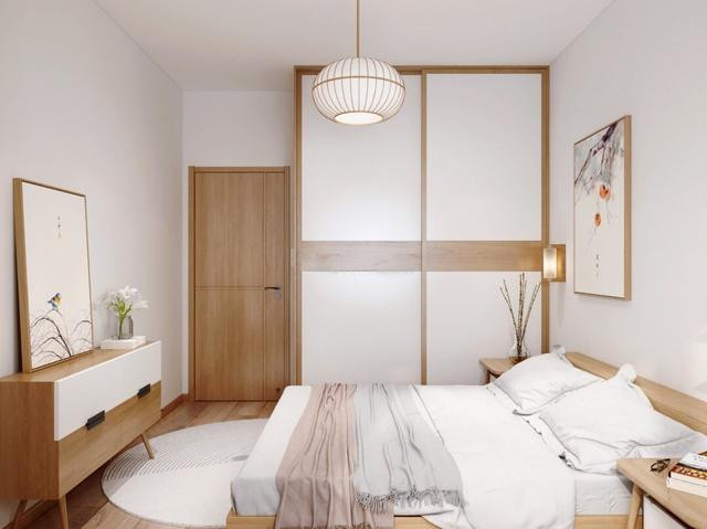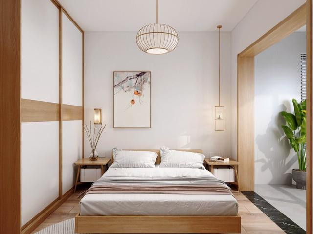 臥室的硬裝裝修部分相當(dāng)簡單,大白墻搭配著大面積的原木色,一點都不會顯得單調(diào)。地板也用了原木色,讓整體色調(diào)保持一種平衡的狀態(tài)。床頭背景墻面,掛著一幅漂亮的裝飾畫,搭配著壁燈和小吊燈,看著又有一種中式風(fēng)格的禪意氣質(zhì)。