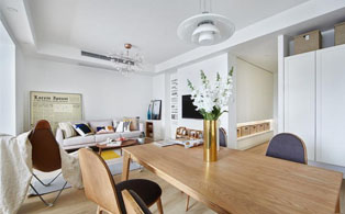 屏風(fēng)的另一邊是餐廳區(qū)域,這個戶型有一個明顯的特點,就是客廳和餐廳兩個區(qū)域的頂面是沒有梁的,所以在頂部不做吊頂?shù)那闆r下,可以只用石膏板做一圈簡單的頂線,效果看上去簡潔又大方!