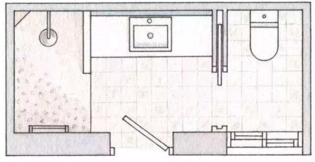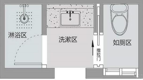 常見的衛(wèi)生間戶型是長方形和正方形,但很多家庭是一字型衛(wèi)生間,這種衛(wèi)生間是不適合做三式分離,它更適合干濕分離,將洗手臺移到外面,用推拉門隔開淋浴區(qū)和馬桶區(qū)。
