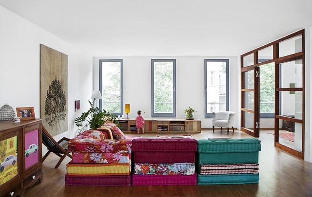 帶有多彩光彩的模塊化沙發使白色的起居空間充滿活力。