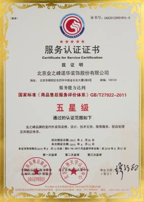 正因為如此,2012年9月26日,經第三方嚴格評審,業之峰榮獲最高等級標準——五星級服務認證,從而成為家居行業為數不多通過五星級服務認證的企業。