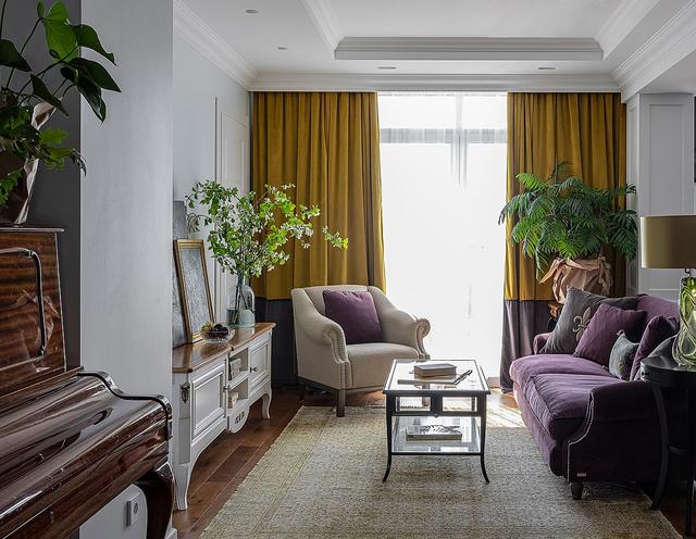傳統客廳,空間有限,大膽的紫色沙發和黃色的窗簾。