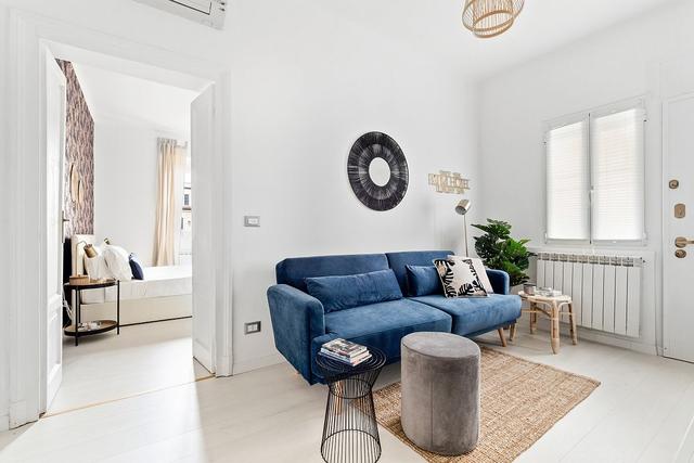 明亮的藍色沙發是白色小現代客廳的理想選擇。