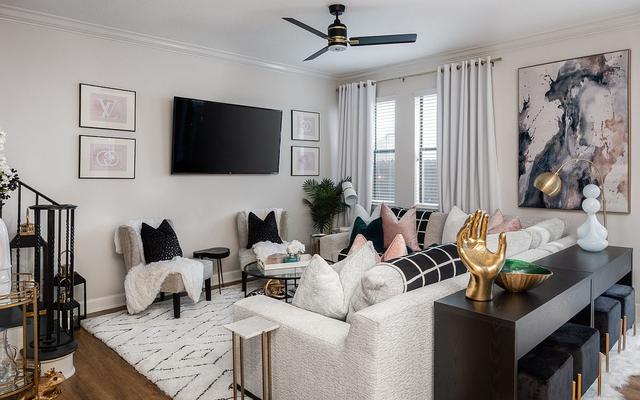 時髦的地毯在不改變其調色板的情況下為這個小客廳增添了圖案。