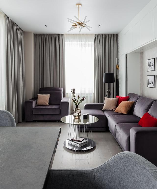 灰色截面為帶有紅色裝飾的小客廳增添了色彩。
