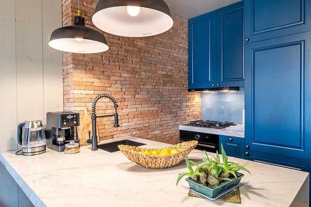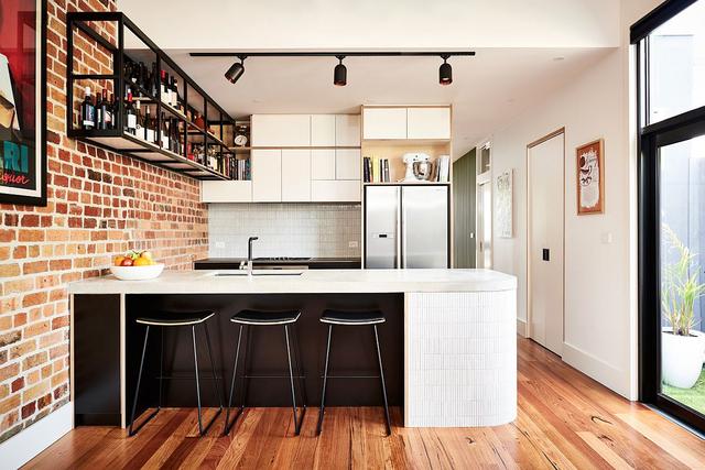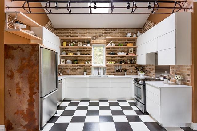 通過巧妙的布置和正確使用櫥柜,將廚房中裸露的磚墻變成焦點。