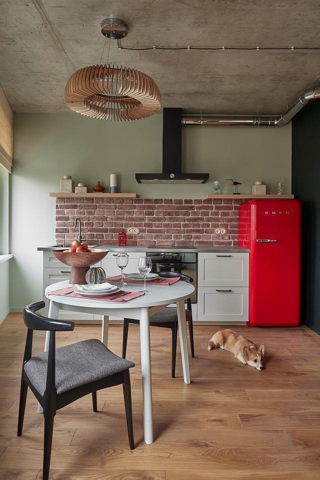 紅色冰箱為莫斯科這間小型工業廚房增添了色彩,帶有復古氣息。