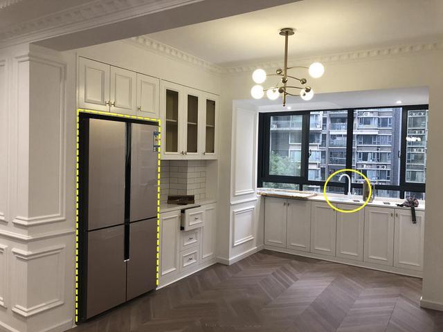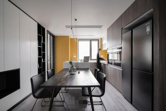 延伸過(guò)來(lái)的這些空間,可以用矮柜+高柜的結(jié)合式設(shè)計(jì),家中這邊用到的家電,就可以把它們都放置到餐廳這邊來(lái),為廚房騰出更大的使用空間。
