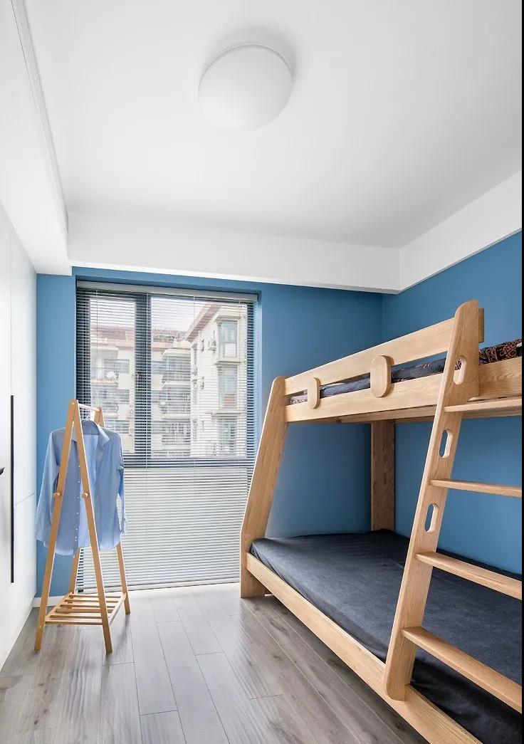 次臥延續主臥的風格藍色墻面搭配原木地板簡約自然高低床也更為實用