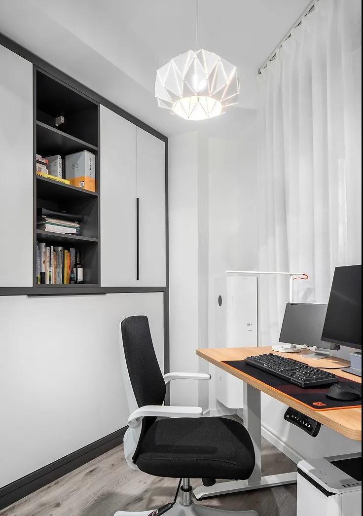 設計師把沙發往前移利用多出來的面積做個獨立的書房巧用隔斷設計讓小戶型客廳的利用率更高