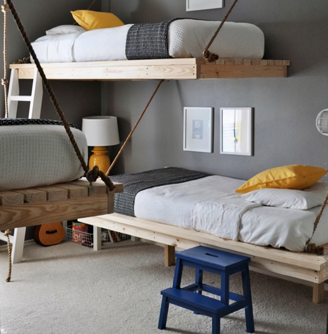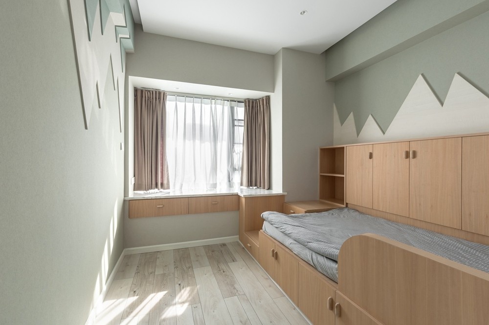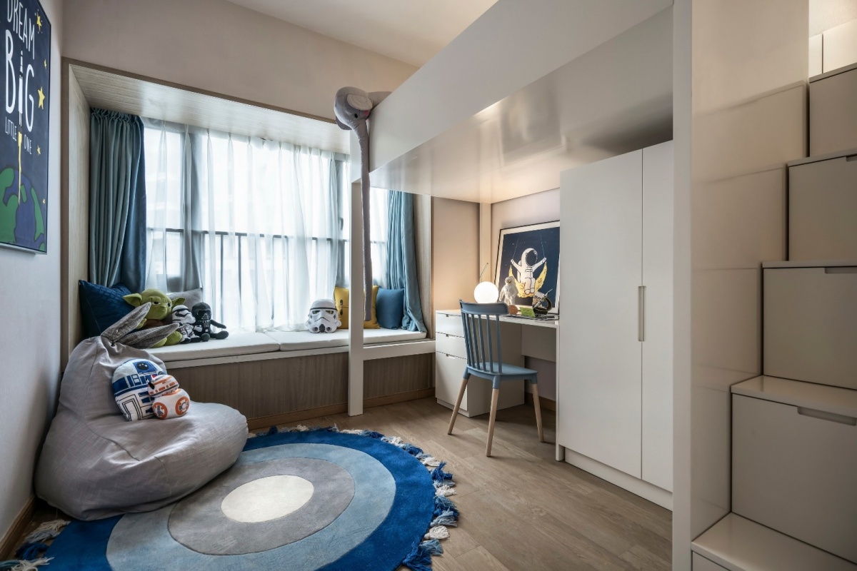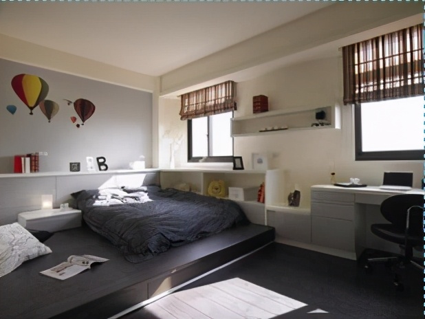 沒有任何人規定,床和柜子一定要分開放置。高低床的設計更適合兒童房,把床鋪抬高,下面設計成衣柜和書桌,也不失為一種很好的解決方法。