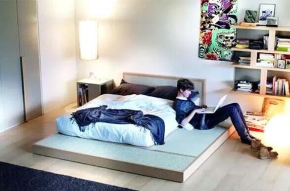 地臺床高度很低,睡前看的雜志、喝的水杯、還有手機等物品,隨手放在地面也可以,如此一來就可以省去兩個床頭柜的空間。